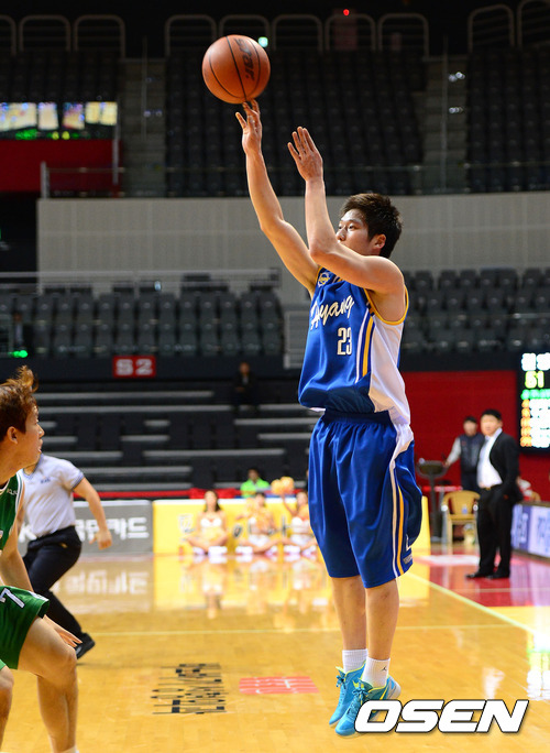 29일 오후 경기 고양시 고양실내체육관에서 열린 '2012 KB국민카드 프로-아마 최강전' 원주 동부와 한양대의 경기, 3쿼터 한양대 최원혁이 동점 3점슛을 성공시키고 있다.