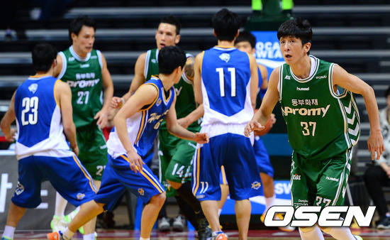 29일 오후 경기 고양시 고양실내체육관에서 열린 '2012 KB국민카드 프로-아마 최강전' 원주 동부와 한양대의 경기, 4쿼터 동부 박지현이 3점슛을 성공시키고 수비 위치로 가고 있다.