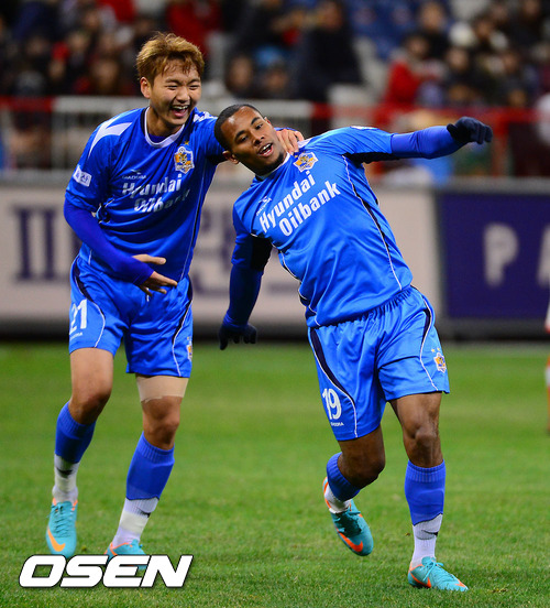 29일 오후 부산 아시아드주경기장에서 열린 현대오일뱅크 K리그 2012 그룹A 부산 아이파크와 울산 현대의 경기 후반 울산 하피냐가 선취골을 넣고 환호하고 있다