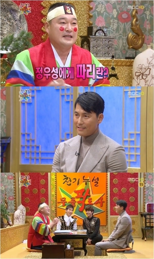 정우성은 29일 방송된 MBC 예능 프로그램 ‘황금어장-무릎팍도사’에 첫 게스트로 출연했다. 이날 유세윤은 “정우성에게 파리의 연인이란?”이라는 질문을 던졌고 강호동도 “정우성에게 파리란?”이라고 덧붙였다.