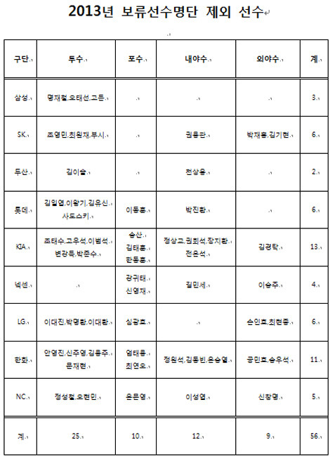 공시된 명단은 2012년 시즌 KBO에 등록되었던 530명의 선수와 시즌 중 추가등록한 44명, 시즌 종료 후 추가등록한 군제대 선수 및 신고선수 23명을 합한 총 597명 가운데 56명의 선수가 보류선수 명단에서 제외된 명단이다.