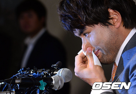 기자회견 중 박찬호가 코를 만지고 있다.