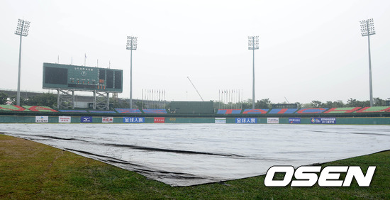 30일 오후 대만 타이중 인터컨티넨탈구장에서 열리는 '제26회 아시아야구선수권대회' 한국과 파키스탄의 경기 시작 전 그라운드에 방수포가 덮여 있다.