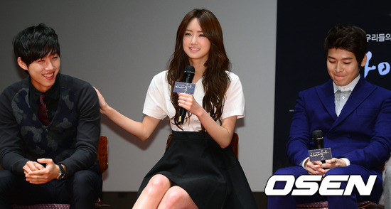 30일 오후 서울 광진구 자양동 롯데시네마 건대입구에서 열린 영화 '차이나 블루' 언론배급시사회에서 정주연이 사회자의 이상형을 지목해 달라는 질문에 백성현을 선택하고 있다.