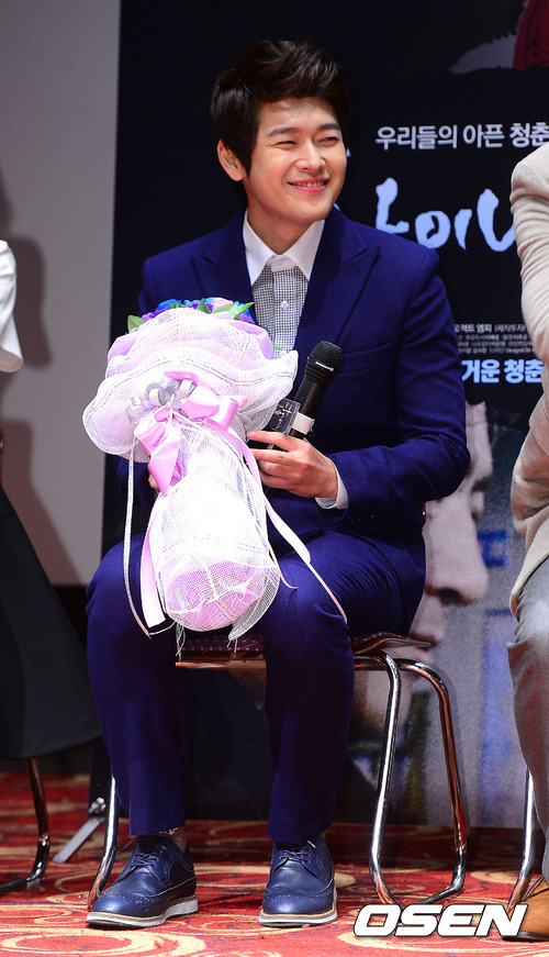 30일 오후 서울 광진구 자양동 롯데시네마 건대입구에서 열린 영화 '차이나 블루' 언론배급시사회에서 김주영이 여성팬에게 꽃다발을 건내받고 즐거운 미소를 짓고 있다.