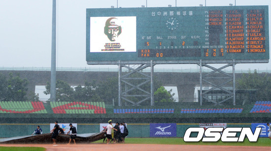 30일 오후 대만 타이중 인터컨티넨탈구장에서 열린 '제26회 아시아야구선수권대회' 한국과 파키스탄의 경기 3회초 2사 3루 오선진의 타석, 폭우로 경기가 중단되고 있다.