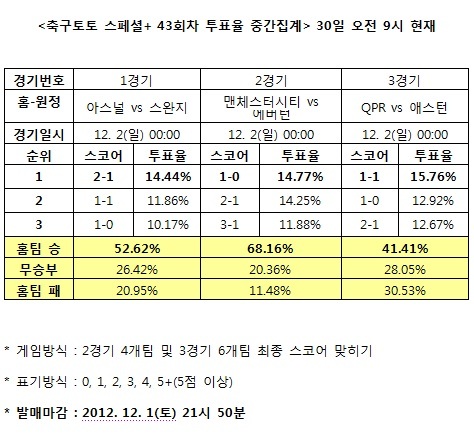 [축구토토] 국민체육진흥공단(www.kspo.or.kr)이 발행하는 체육진흥투표권 수탁사업자인 스포츠토토 공식 온라인 발매 사이트인 베트맨(www.betman.co.kr)은 내달 2일에 펼쳐지는 아스널-스완지(1경기), 맨체스터시티-에버턴(2경기), QPR-애스턴(3경기)전 등 잉글랜드 프리미어리그 3경기를 대상으로 한 축구토토 스페셜+ 43회차 투표율 중간집계 결과, 축구팬 41.41%는 3경기 QPR-애스턴전에서 올 시즌 아직 승리가 없는 QPR의 근소한 우세를 예상했다고 밝혔다.