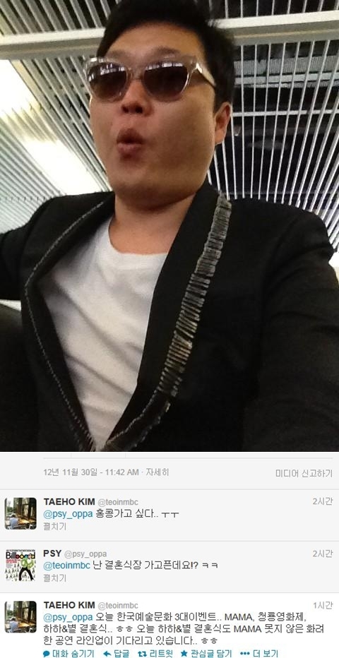 엠넷 MAMA(Mnet Asia Music Awards, 이하 MAMA) 참석을 위해 홍콩에 체류중인 싸이는 30일 자신의 트위터에 "홍콩! 오늘 저녁 준비 됐나요?(HongKong Are you ready tonight?)"라는 글과 함께 자신의 사진을 올렸고, 이에 김태호PD가 "홍콩가고 싶다"라는 답글을 달았다.