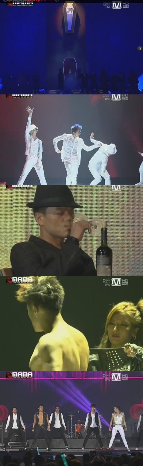 [OSEN=박지언 인턴기자] 가수 박진영이 '2012 엠넷 아시안 뮤직 어워드(이하 MAMA)'에서 장우영과 합동 무대를 꾸미며 관 속에서 등장하고 상의 탈의를 하는 깜짝 퍼포먼스를 펼쳤다.