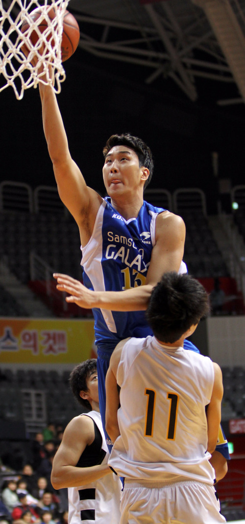삼성 센터 유성호가 골밑을 완벽하게 장악, 팀 내 최다 20점 10리바운드 더블더블로 활약하며 대학 후배들에게 프로 형님의 힘을 과시했다.