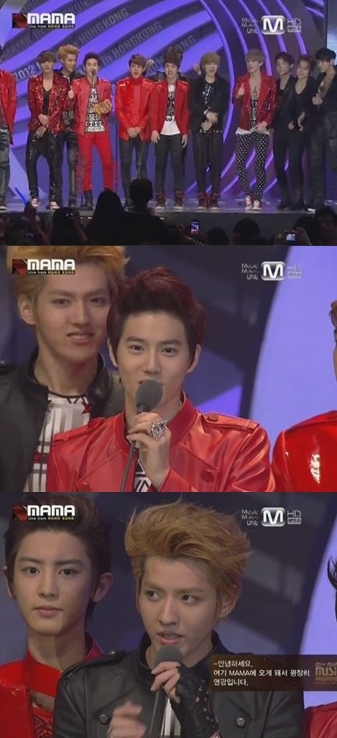 이어 EXO는 "여기 MAMA에 오게 돼서 굉장히 영광입니다. 사실 우리 EXO가 상을 받게 된 것은 우리에게 의미가 깊습니다. 우리 회사 여러분께 감사드립니다. 저희를 지지해주셔서 감사합니다"라는 중국어로 또 한 번 수상 소감을 전했다.