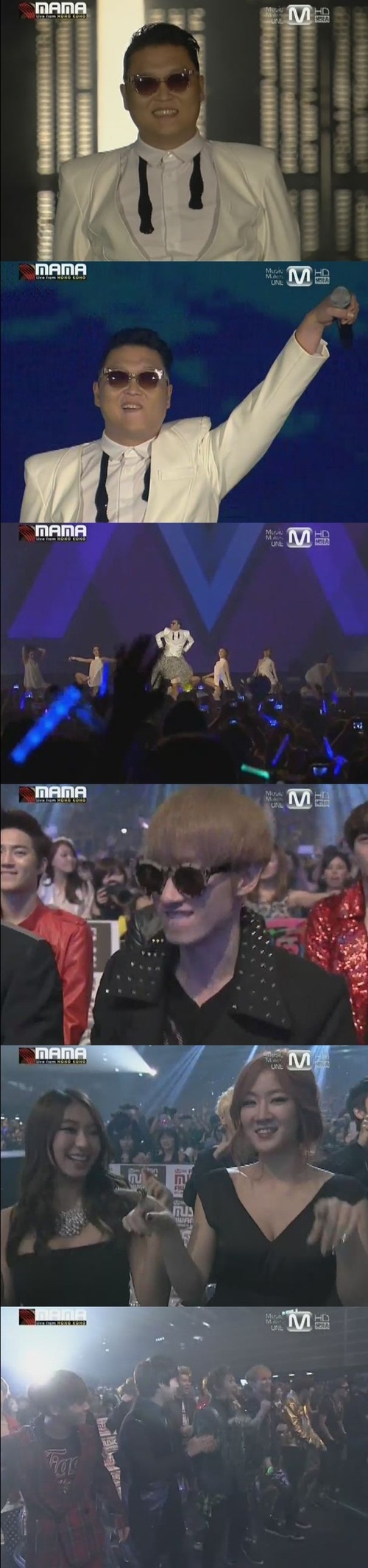 싸이는 흰 셔츠와 바둑판 문양의 배기 팬츠를 입고 등장해 '강남스타일' 퍼포먼스를 펼쳤고 팬들을 비롯한 그룹 슈퍼주니어, 씨스타, 샤이니 등 'MAMA'에 참가한 스타들 역시 말춤을 추며 싸이의 무대를 응원했다.
