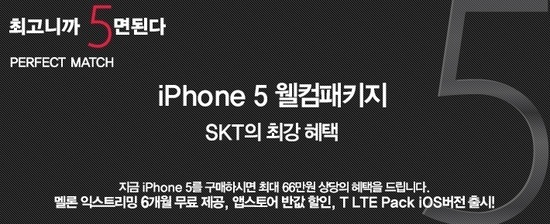 SK텔레콤의 경우 ‘아이폰5 웰컴패키지’ 이벤트를 제공한다. 가장 눈에 띄는 혜택은 ‘T에코 보상’이다 기존에 쓰던 휴대폰을 반납하면 최대 44만원(아이폰4 NEW등급 기준)까지 할인해준다. 기존에 갤럭시S시리즈를 사용하던 이들도 최대 22만 6000원(갤럭시S2 NEW등급기준)까지 할인받아 아이폰5 구매가 가능하다.