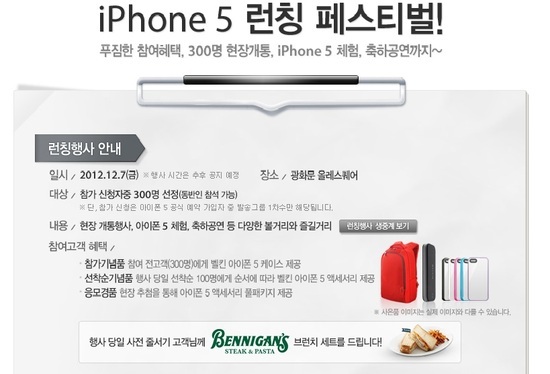 또 KT는 아이폰 정식판매가 시작되는 12월 7일 자정에 ‘아이폰5 런칭행사’를 개최해 참석한 300명에게 현장개통과 다양한 축하공연을 제공한다. 1차 공식 가입자들 중 참가신청을 하면 참여할 수 있다.