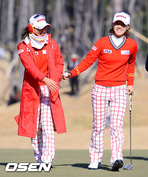 1일 부산 베이사이드 G.C.에서 열린 KB금융컵 제11회 한일 여자프로골프 국가대항전에서 6번홀 파퍼팅 성공 후 최나연이 김자영에게 골프공을 건네고 있다