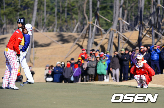 1일 부산 베이사이드 G.C.에서 열린 KB금융컵 제11회 한일 여자프로골프 국가대항전 6번홀 김자영이 최나연의 퍼팅라인을 살피고 있다