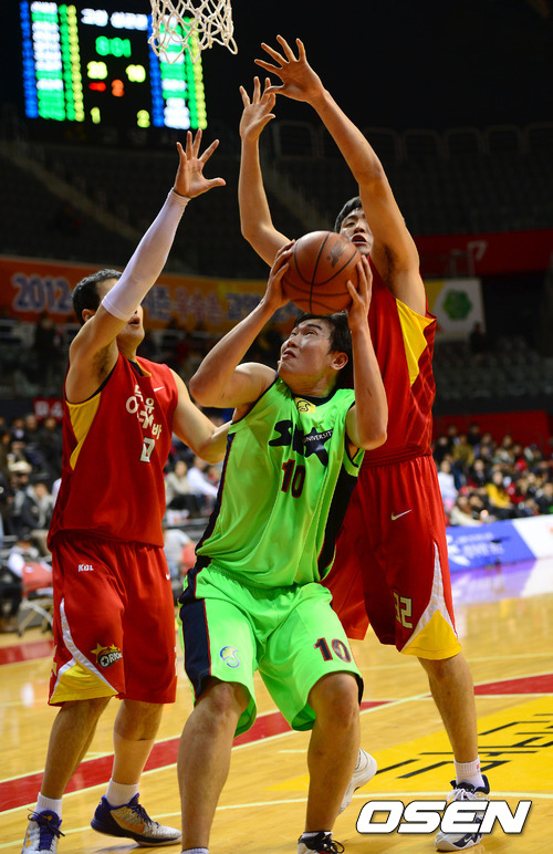 1일 오후 경기 고양시 고양실내체육관에서 열린 '2012 KB국민카드 프로-아마 최강전' 고양 오리온스와 성균관대의 경기 2쿼터 성균관대 김만종이 오리온스 김민섭과 김승원의 더블팀에 걸려 고전하고 있다.