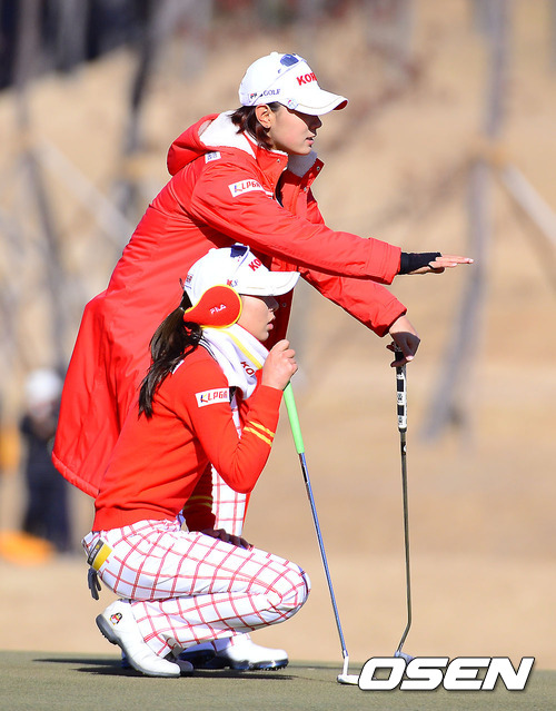 1일 부산 베이사이드 G.C.에서 열린 KB금융컵 제11회 한일 여자프로골프 국가대항전,최나연이 김자영의 퍼팅라인을 지켜보고 있다