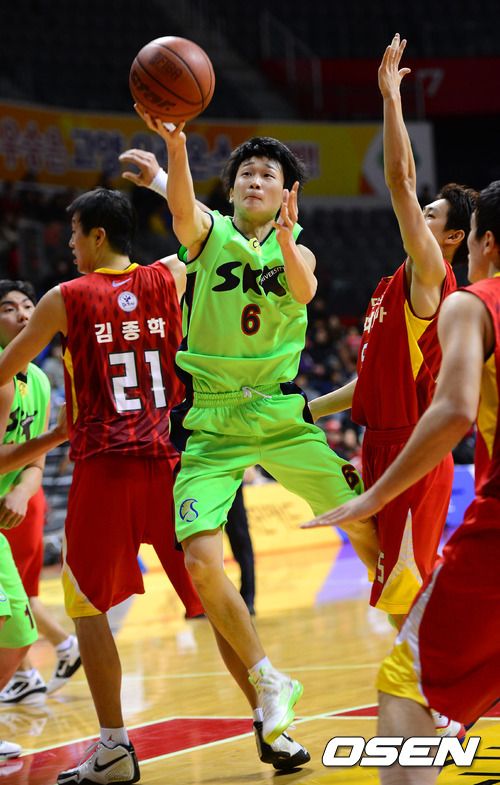 1일 오후 경기 고양시 고양실내체육관에서 열린 '2012 KB국민카드 프로-아마 최강전' 고양 오리온스와 성균관대의 경기 2쿼터 성균관대 배재광이 레이업슛을 시도하고 있다.