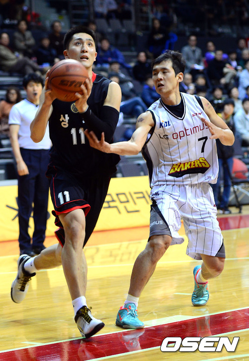 1일 오후 경기 고양시 고양실내체육관에서 열린 '2012 KB국민카드 프로-아마 최강전' 창원 LG와 상무의 경기 1쿼터 상무 기승호가 LG 양우섭의 수비를 피해 골밑 돌파를 시도하고 있다.