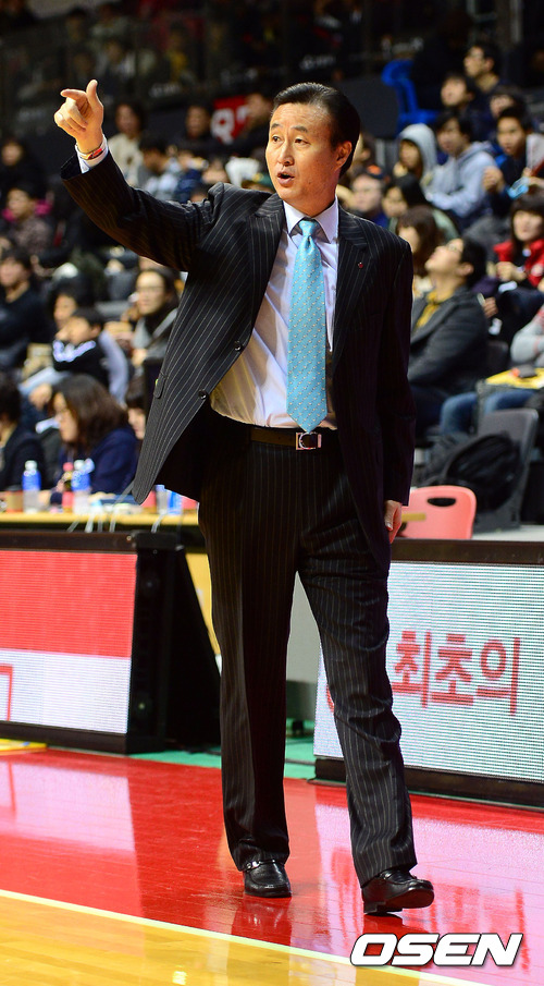 1일 오후 경기 고양시 고양실내체육관에서 열린 '2012 KB국민카드 프로-아마 최강전' 창원 LG와 상무의 경기 1쿼터 LG 김진 감독이 선수들에게 작전지시를 하고 있다.