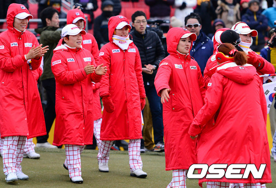 마지막 접전을 펼친 포볼 허윤경-양수진 조의 경기가 끝난 후 한국팀 선수들이 기쁨을 나누고 있다. /soul1014@osen.co.kr
