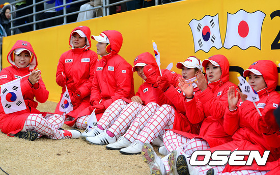경기를 끝낸 한국대표팀 선수들이 허윤경-양수진 조의 경기를 보며 열띤 응원을 펼치고 있다 /soul1014@osen.co.kr
