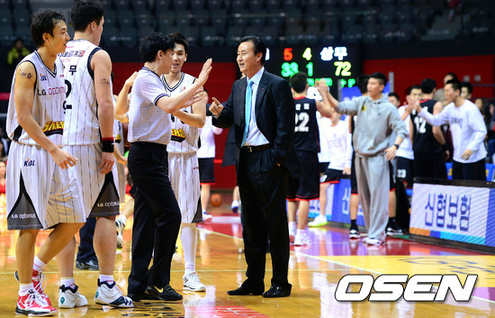 1일 오후 경기 고양시 고양실내체육관에서 열린 '2012 KB국민카드 프로-아마 최강전' 창원 LG와 상무의 경기 4쿼터 LG 김진 감독이 심판의 판정에 어필하고 있다.