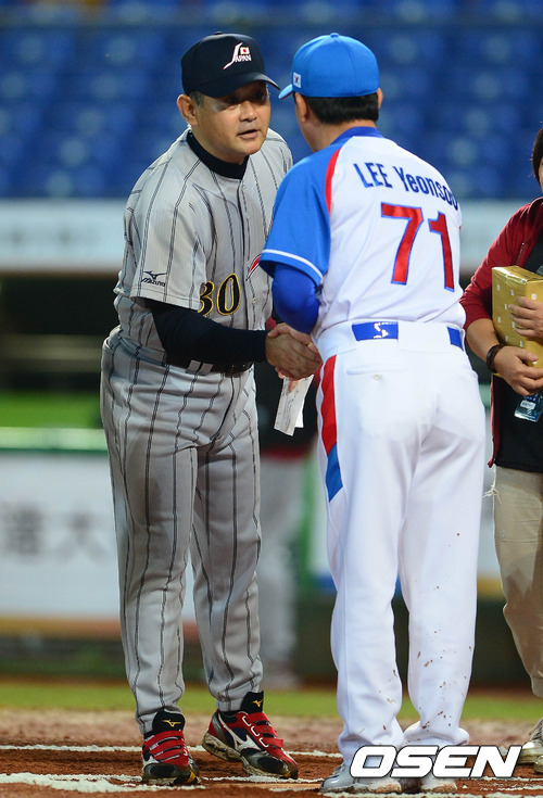 1일 오후 대만 타이중 인터컨티넨탈구장에서 열린 '제26회 아시아야구선수권대회' 한국과 일본의 경기 시작 전 이연수 감독과 일본 고지마 감독이 악수를 나누고 있다.