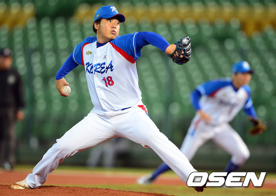 1일 오후 대만 타이중 인터컨티넨탈구장에서 열린 '제26회 아시아야구선수권대회' 한국과 일본의 경기 선발 김기태가 역투하고 있다.