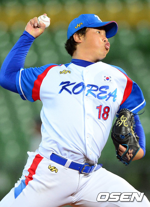 1일 오후 대만 타이중 인터컨티넨탈구장에서 열린 '제26회 아시아야구선수권대회' 한국과 일본의 경기 선발 김기태가 역투하고 있다.