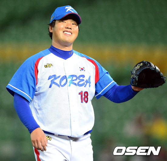 1일 오후 대만 타이중 인터컨티넨탈구장에서 열린 '제26회 아시아야구선수권대회' 한국과 일본의 경기 2회초 2사 1,2루 후지시마를 뜬공으로 처리하며 1실점으로 마무리한 김기태가 미소를 지으며 덕아웃으로 걸어오고 있다.