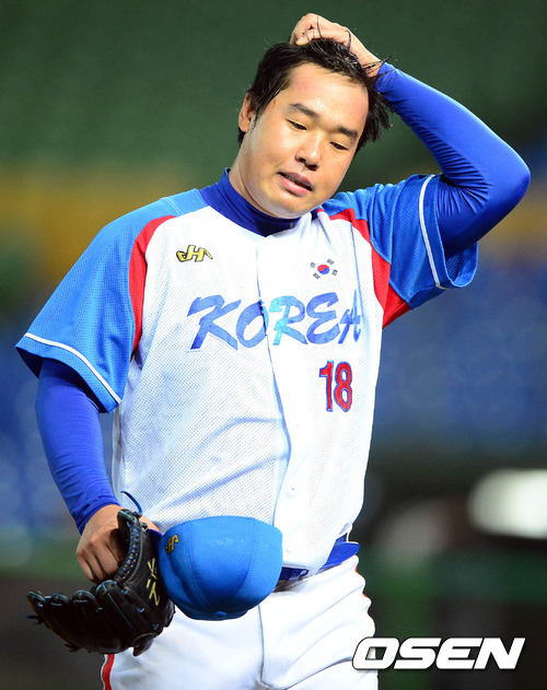 1일 오후 대만 타이중 인터컨티넨탈구장에서 열린 '제26회 아시아야구선수권대회' 한국과 일본의 경기 2회초 2사 1,2루 후지시마를 뜬공으로 처리하며 1실점으로 마무리한 김기태가 덕아웃으로 걸어오고 있다.