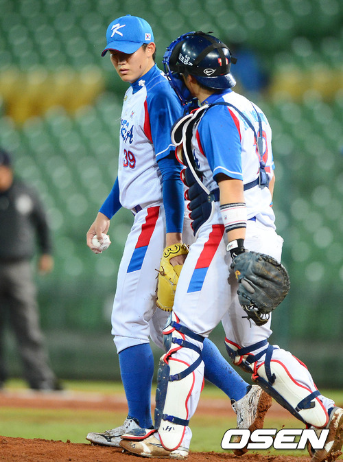 1일 오후 대만 타이중 인터컨티넨탈구장에서 열린 '제26회 아시아야구선수권대회' 한국과 일본의 경기 4회초 2사 2루 후지시마의 타석, 김대우와 최재훈이 이야기를 나누고 있다.