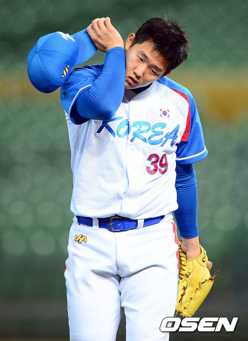 1일 오후 대만 타이중 인터컨티넨탈구장에서 열린 '제26회 아시아야구선수권대회' 한국과 일본의 경기 4회초를 마친 김대우가 땀을 닦으며 덕아웃으로 향하고 있다.
