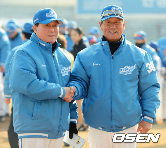 2일 오후 수원야구장에서 열린 국내 프로야구 최초의 자선경기 ‘HOPE+ Charity Baseball Match’ (희망더하기 자선 야구대회 2012)에서 김인식 통일팀 감독과 김성근 평화팀 감독이 악수를 나누고 있다.