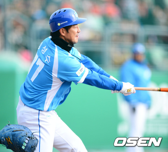 2일 오후 수원야구장에서 열린 국내 프로야구 최초의 자선경기 ‘HOPE+ Charity Baseball Match’ (희망더하기 자선 야구대회 2012)에서 1회초 1사 주자 2루 통일팀 김성수가 1타점 적시타를 날리고 있다.
