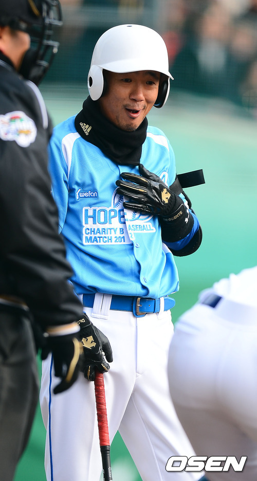 2일 오후 수원야구장에서 열린 국내 프로야구 최초의 자선경기 ‘HOPE+ Charity Baseball Match’ (희망더하기 자선 야구대회 2012)에서 2회초 2사 주자 1루 타석에 오른 통일팀 이하늘이 이우선의 빠른볼에 놀라고 있다.