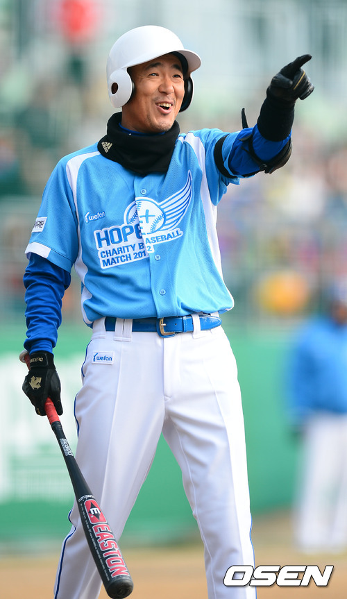 2일 오후 수원야구장에서 열린 국내 프로야구 최초의 자선경기 ‘HOPE+ Charity Baseball Match’ (희망더하기 자선 야구대회 2012)에서 2회초 2사 주자 1루 타석에 오른 통일팀 이하늘이 손짓을 하고 있다.
