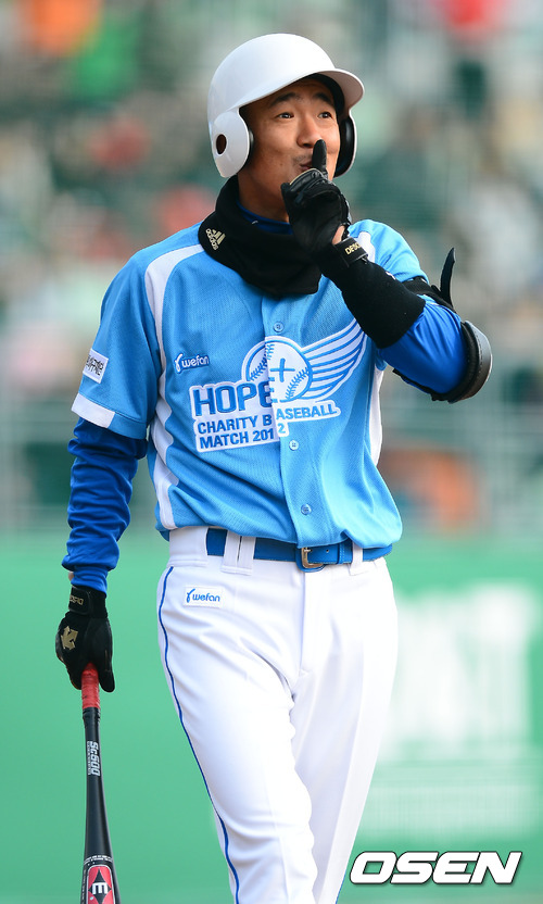 2일 오후 수원야구장에서 열린 국내 프로야구 최초의 자선경기 ‘HOPE+ Charity Baseball Match’ (희망더하기 자선 야구대회 2012)에서 2회초 2사 주자 1루 타석에 오른 통일팀 이하늘이 손짓을 하고 있다.