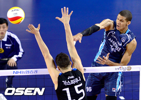 2일 오후 천안 유관순체육관에서 열린 '2012-2013 NH농협 V-리그' 현대캐피탈과 삼성화재의 경기 1세트 삼성화재 레오가 현대캐피탈 가스파리니를 앞에두고 대각선 공격을 시도하고 있다.
