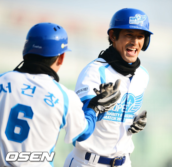 2일 오후 수원야구장에서 열린 국내 프로야구 최초의 자선경기 ‘HOPE+ Charity Baseball Match’ (희망더하기 자선 야구대회 2012)에서 5회말 무사 주자 1,3루 평화팀 이용규의 번트안타때 오지호가 홈을 밟은 후 기뻐하고 있다.