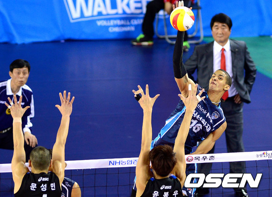 2일 오후 천안 유관순체육관에서 열린 '2012-2013 NH농협 V-리그' 현대캐피탈과 삼성화재의 경기 1세트 삼성화재 레오가 현대캐피탈 선수들의 블로킹을 피해 직선타를 때리고 있다.