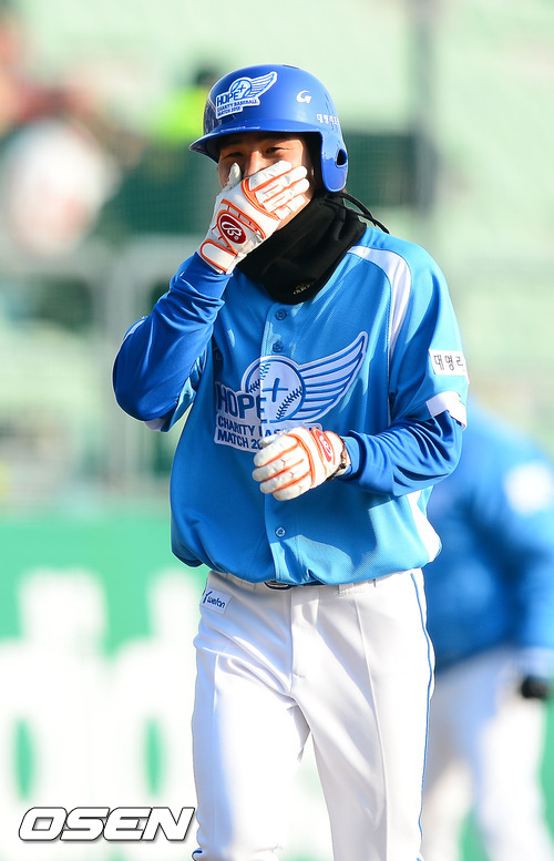 2일 오후 수원야구장에서 열린 국내 프로야구 최초의 자선경기 ‘HOPE+ Charity Baseball Match’ (희망더하기 자선 야구대회 2012)에서 5회초 2사 김상수가 스리런 홈런을 날린 후 기뻐하고 있다.