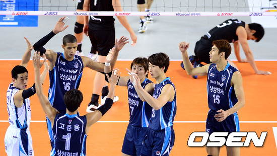 2일 오후 천안 유관순체육관에서 열린 '2012-2013 NH농협 V-리그' 현대캐피탈과 삼성화재의 경기 1세트 삼성화재 레오가 득점을 올린 후 동료들과 기뻐하고 있다.
