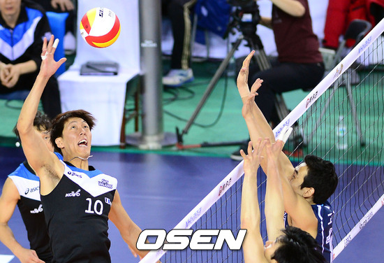 2일 오후 천안 유관순체육관에서 열린 '2012-2013 NH농협 V-리그' 현대캐피탈과 삼성화재의 경기 2세트 현대캐피탈 윤봉우가 삼성화재 블로킹을 피해 가볍게 공을 넘기고 있다.