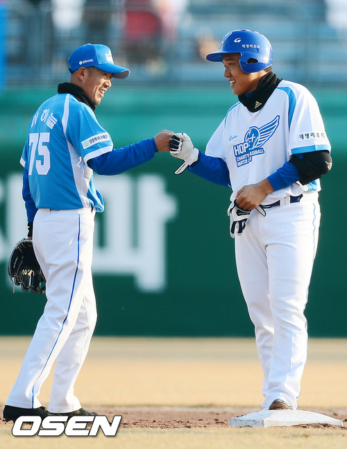 2일 오후 수원야구장에서 열린 국내 프로야구 최초의 자선경기 ‘HOPE+ Charity Baseball Match’ (희망더하기 자선 야구대회 2012)에서 5회말 2사 주자 1,3루 평화팀 윤요섭이 2타점 동점 적시타를 날린 후 통일팀 이하늘과 하이파이브를 하고 있다.