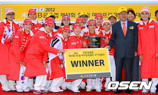 한국은 2일 부산 베이사이드GC 파크레이크 코스에서 열린 2012 KB금융컵 제11회 한일 여자프로골프 국가대항전 싱글 스트로크 매치플레이서 5승 3무 4패를 기록하며 승점 13점을 획득했다. 전날 포섬+포볼 스트로크 경기서 승점 10점을 얻었던 한국은 최종합계 23-13점으로 일본을 꺾었다.