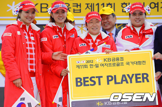 한국은 2일 부산 베이사이드GC 파크레이크 코스에서 열린 2012 KB금융컵 제11회 한일 여자프로골프 국가대항전 싱글 스트로크 매치플레이서 5승 3무 4패를 기록하며 승점 13점을 획득했다. 전날 포섬+포볼 스트로크 경기서 승점 10점을 얻었던 한국은 최종합계 23-13점으로 일본을 꺾었다.