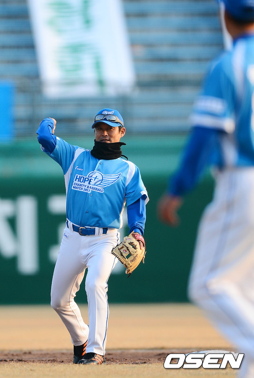 2일 오후 수원야구장에서 열린 국내 프로야구 최초의 자선경기 ‘HOPE+ Charity Baseball Match’ (희망더하기 자선 야구대회 2012)에서 평화팀 유격수로 이종범이 교체투입된 후 볼을 던지고 있다.